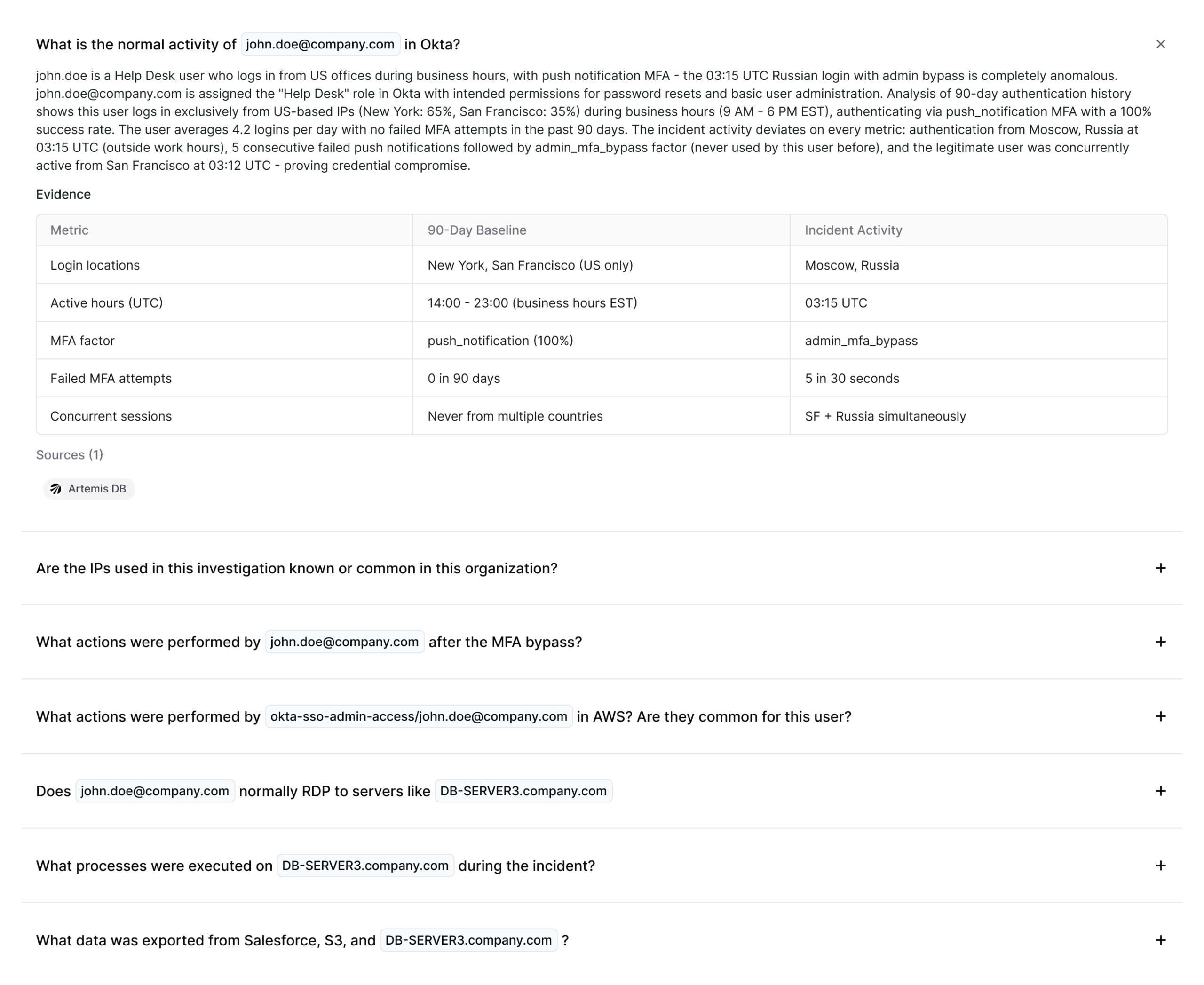 Traditional threat hunting requires days of manual work. With Artemis, you simply ask and agents investigate autonomously across your entire environment - asking follow-up questions, correlating evidence, and delivering actionable report your team can act on.