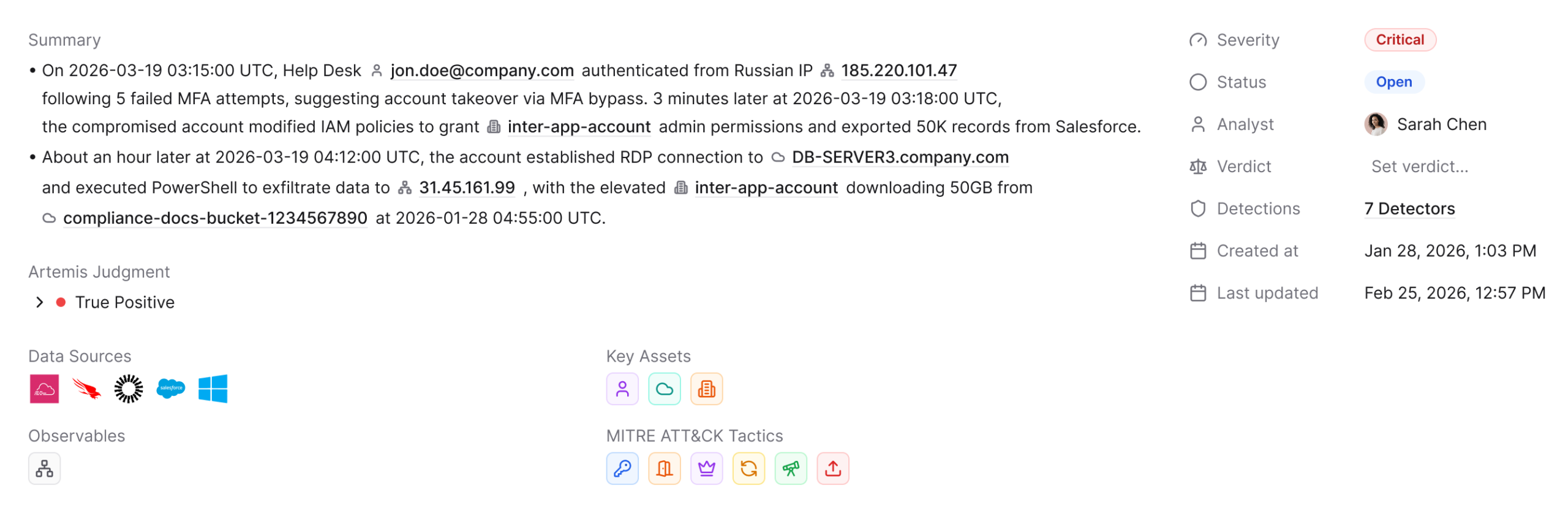 From first signal to final response - Artemis help you handle the entire attack chain. It detects threats, enriches them with context, investigates autonomously by correlating activity across every log source, and delivers a complete case with response actions. Then, you pick it up at the decision point.